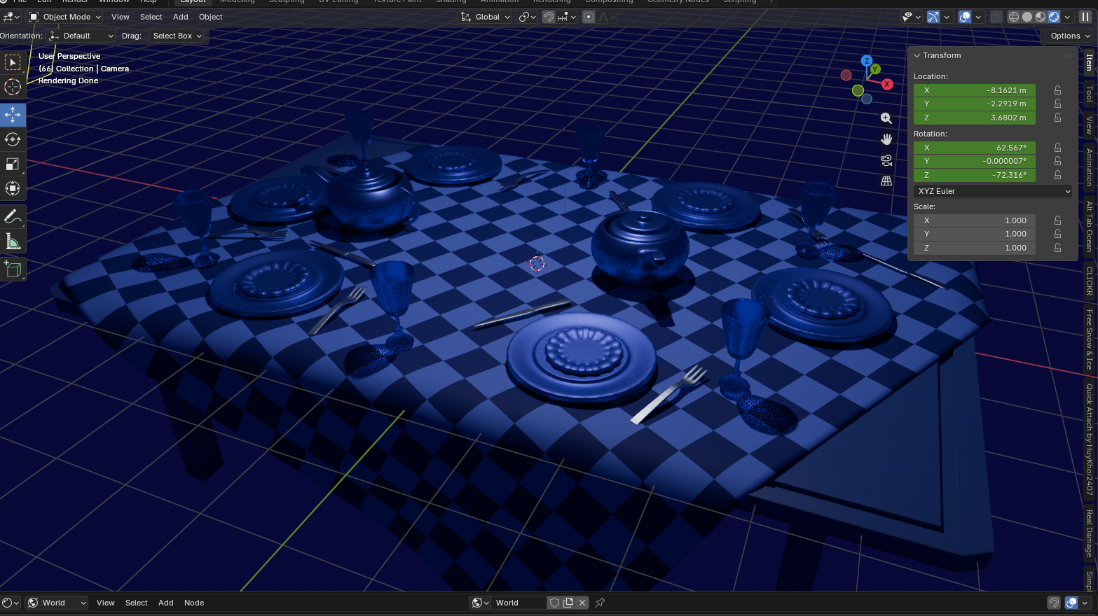 “Moonlit Dinner” is a 3D scene crafted in Blender, wrapped in a monochromatic range of deep blues. Through metallic reflections and a silent, carefully arranged table, the piece radiates an atmosphere of melancholy and quiet loneliness. Every object, bathed in nocturnal tones, reinforces the feeling of a dinner prepared for no one—evoking beauty, stillness, and a subtle sense of unease.